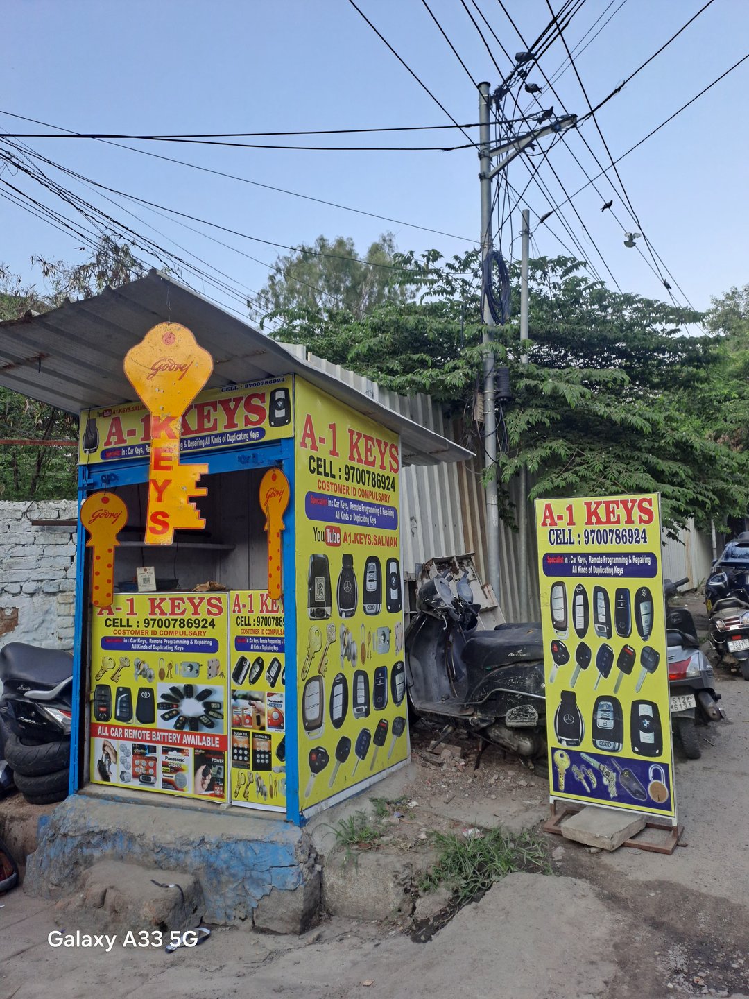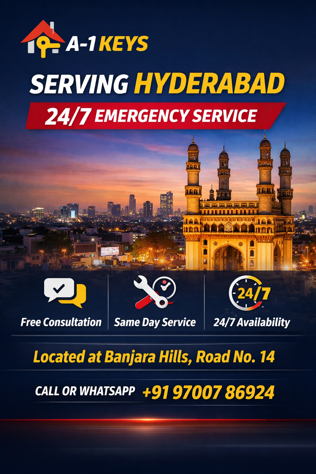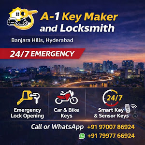 A-1 Keys offers professional key duplication and locksmith services in Banjara Hills, Hyderabad for residential, commercial, and vehicle needs. We specialize in car key duplication, bike key copying, smart key duplication, chip key programming, spare key making, lost key replacement, key repair, remote key repair, and visor key replacement. Our locksmith services include house and office locksmith solutions, car and building lockouts, lock repair, lock rekeying, and door lock hardware support. Customers searching for key maker near me, locksmith near me, car key duplication Hyderabad, or emergency locksmith services trust us for fast, accurate, and affordable solutions. Located at Road No. 14, Banjara Hills, we provide reliable service.